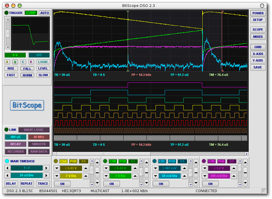 BitScope DSO 2.3 is not recommended for BitScope BS10. Please use this newer version.DSO 2.3 | Minor Update | BL15D2012-05-25 This update fixes a bug which could result in application expiry. This update fixes this problem. 2011-11-16 DSO 2.5 | Stateful "Hold Me Tight" release | BK11FThis update activates the new Perseus Device Manager which holds on to BitScope very tightly. This means that once DSO connects with a BitScope it remains connected until DSO is powered off even if the BitScope is disconnected from the PC. Put another way, DSO remembers the complete BitScope state so if accidentally unplugged or if USB drops out (e.g. because the PC sleeps), DSO will reconnect and restore the BitScope to exactly the same state and continue operating. Owners of older non-isolated USB BitScope models should find this feature very handy; inductive spikes or other sources of EMI that may have in the past terminated the USB connection requiring the BitScope and DSO to be restarted now barely cause a hiccup in normal operation. Connection management has also been automated; it is now not necessary to configure the DSO. Simply connect the BitScope and power up DSO and you're good to go. DSO SETUP is still available if you have multiple BitScopes or if your PC fails to detect the BitScope properly. Please email dso@bitscope.com with bug reports or questions. DSO 2.3 | Pegasus Release | BL15C2011-12-15 This production update includes all the fixes and updates made during DSO 2.3 development. It uses a similar user interface to DSO version 2.2 with some minor tweaks and improvements. We've also back ported some of the new features from 2.5 (Perseus) development version such as the hold me tight USB connection persistence and automatic detection of connected BitScopes. A number of reported bugs are fixed and some elements of the user interface are simplified and improved. Logic traces now use the same multi-colour scheme as BitScope Logic and DSO 2.3 can now share a connection to a Network BitScope with BitScope Logic. DSO 2.3 is available for Windows and Linux. It is compatible with all BitScopes except BS10. Macintosh and BS10 owners should use DSO 2.4 (on CD-ROM) or DSO 2.5. 2011-11-11 DSO 2.5 | Perseus Windows, Linux & Mac | BK04DThis update fixes a problem with the DMG image (for Mac OS X 10.7, Lion). If you could not install the BH21A release on Lion, please use this update which fixes the problem. We've includes a partial fix for problems running on Ubuntu 11.04 and later (caused by Ubuntu's recent adoption of Overlay ScrollBars). This update addresses this problem but if you still have difficulty you can run DSO in an xterm to avoid the issue as: $ LIBOVERLAY_SCROLLBAR=0 bitscope-dso